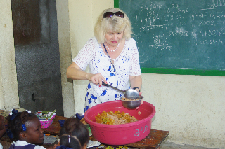 Pastor Dick and Sandra Stark returned home on Wednesday. Sandra wasn’t feeling well during much of the trip, but she was determined to come with us to Petite-Anse to see the feeding program in action. She even wanted to take part in serving the food! Here she is preparing a bowl of rice and beans with a vegetable topping for some hungry students.We are so grateful for the generous giving of Faith Temple towards our feeding program. Would you like to get involved and make a difference in a student’s life? One of my favorite sayings is, “Little is much when God is in it.” You may be thinking that you have so little to give, but it only costs roughly 40 cents for one meal in order to end a child’s hunger. You can make an impact in someone’s life today!